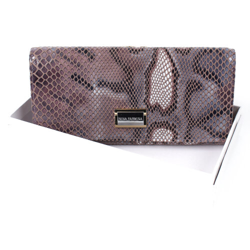 Стильный женский кошелек выполнен из натуральной кожи с фактурой «змея», закрывается на кнопку.